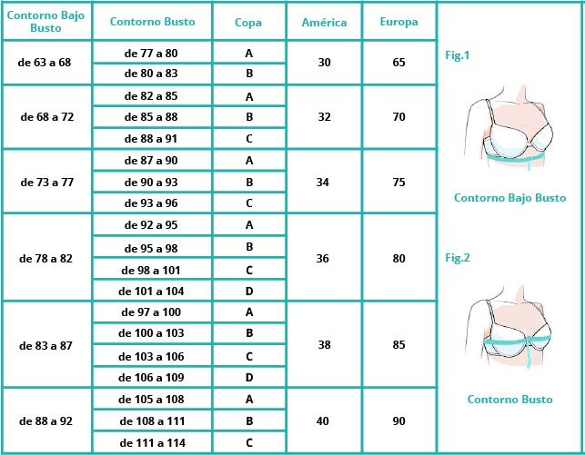 Una vez que tengas estas dos medidas, puedes determinar la talla de la copa utilizando la siguiente tabla: