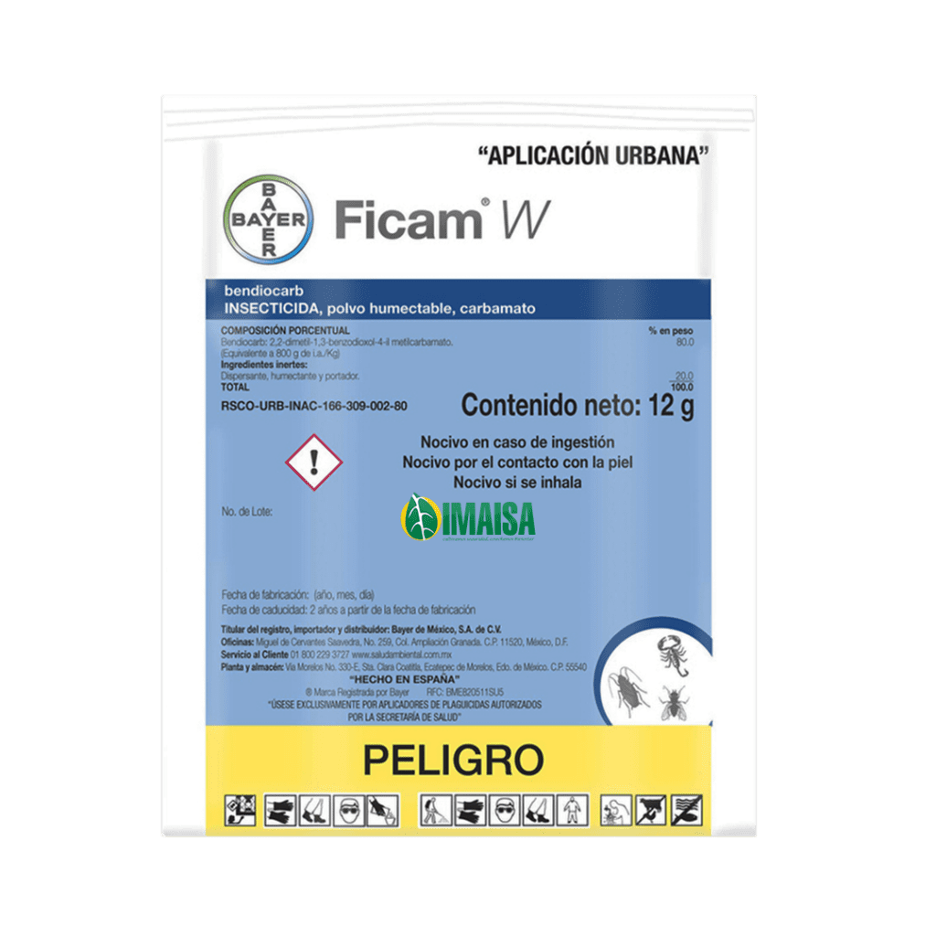 Ficam W contiene Bendiocarb al 80%, un insecticida de amplio espectro efectivo contra diversas plagas en agricultura y jardinería.