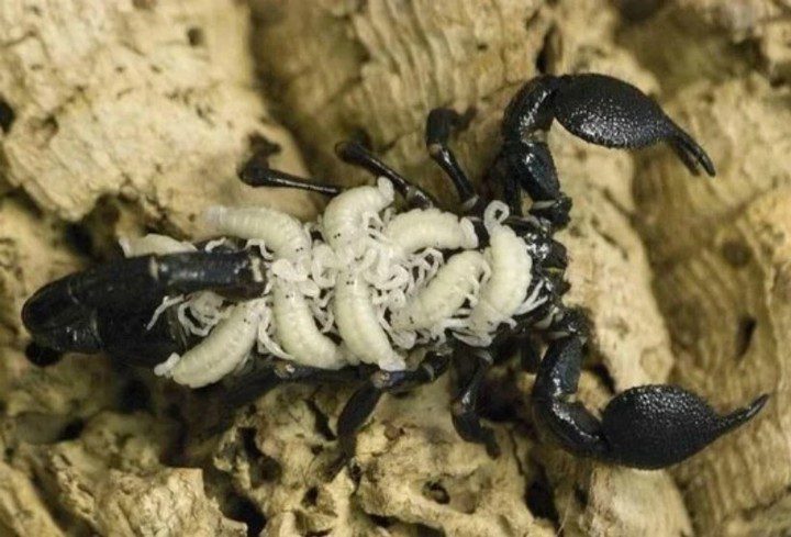 Las crías de un alacrán nacen vivas y se quedan en la espalda de la madre hasta que mudan su exoesqueleto por primera vez.