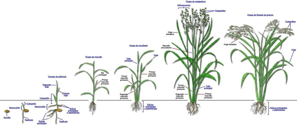 La planta del arroz crece en etapas: germinación, crecimiento vegetativo y formación de espigas. Necubre todos los detalles.