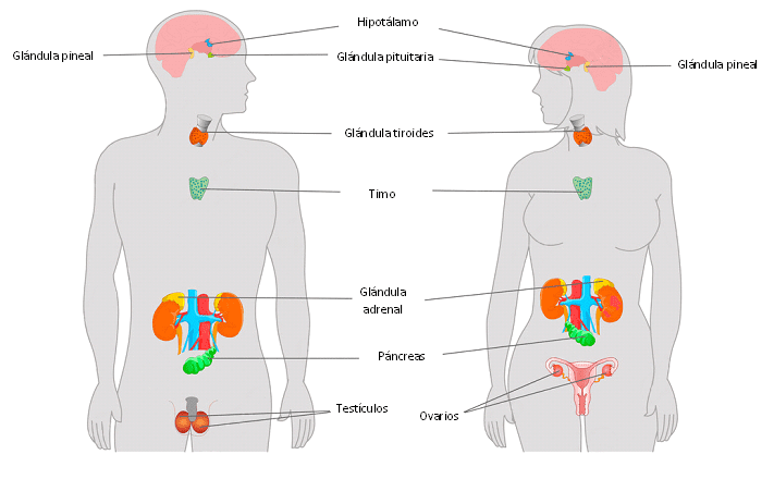 El sistema endocrino está formado por glándulas como la hipófisis, la tiroides, las paratiroides, las suprarrenales, el páncreas y los ovarios/testículos.