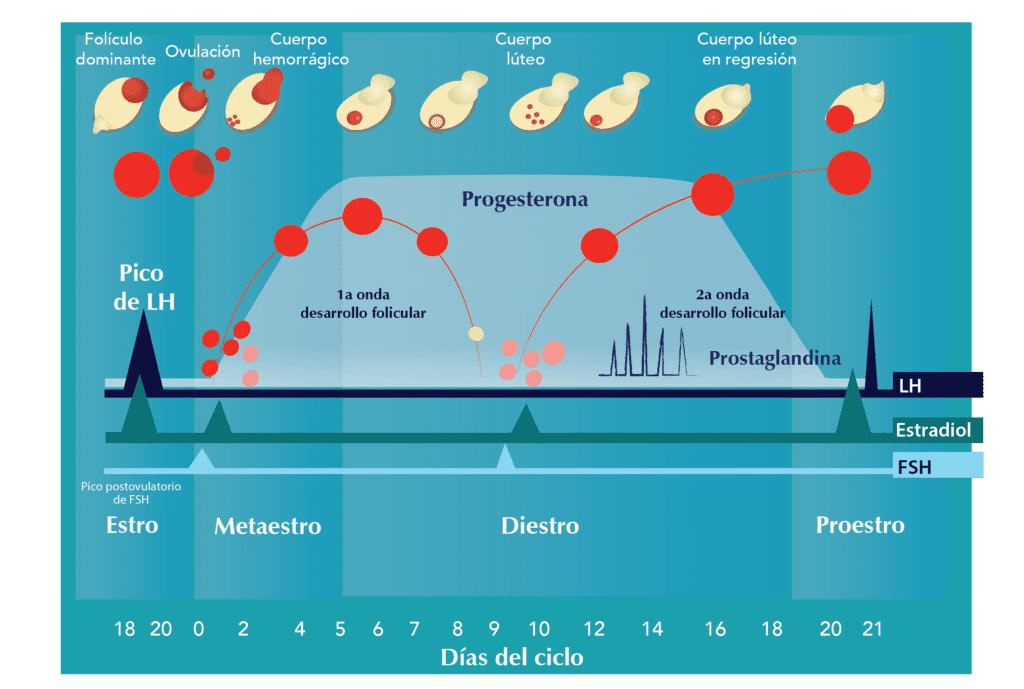 El celo suele durar entre 2 y 4 semanas, dividiéndose en proestro, estro y diestro.