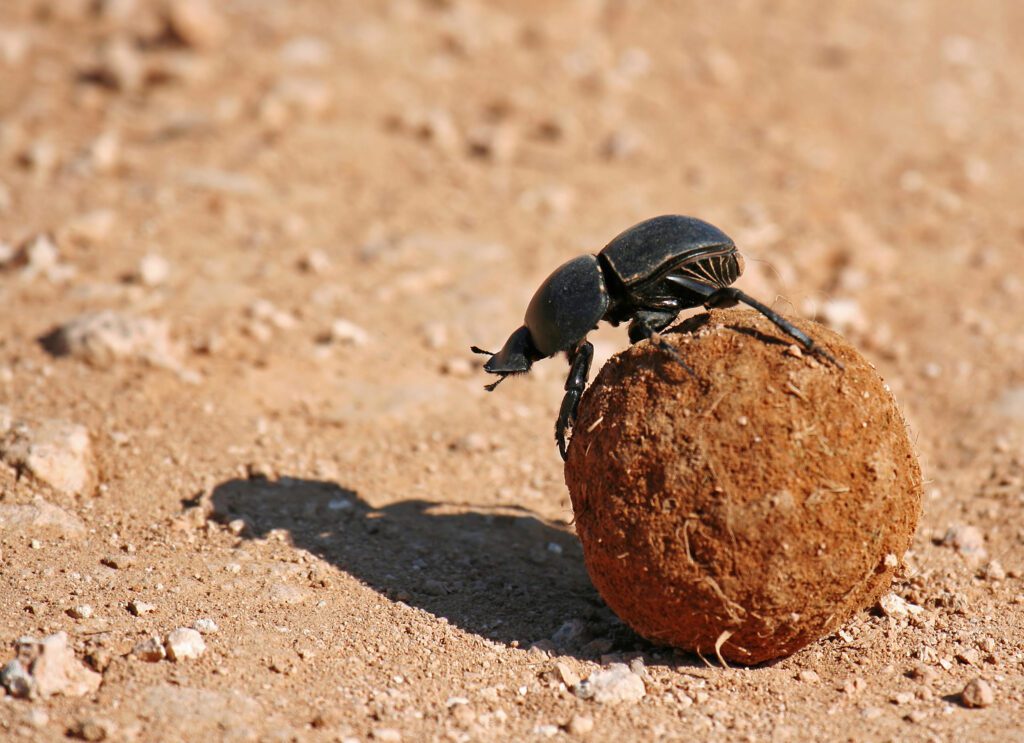 El escarabajo pelotero, un insecto fascinante, crea bolas de excremento para alimentar a sus larvas y demostrar su fuerza. ¡Impresionante!