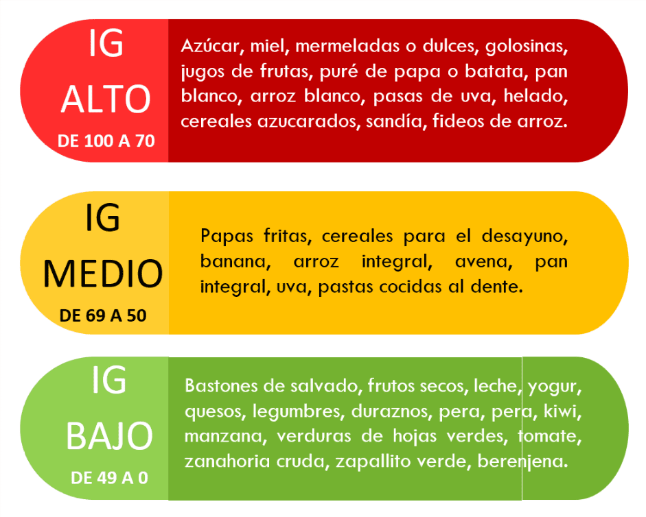 | Alimento | Índice Glucémico Bajo | Índice Glucémico Alto |